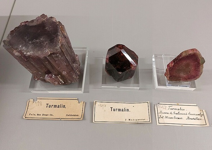 Turmalin, Ringsilikat, bereits antike Überlieferungen wundersamer Kräfte, Senckenberg-Sammlungen Dresden, Deutschland