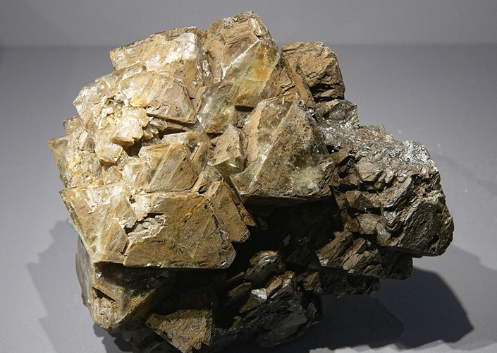 Magnetit (Magneteisenstein), sehr häufig vorkommendes Mineral, hier Oktaeder (silbern) auf Chalkopyrit (golden) aus Südafrika