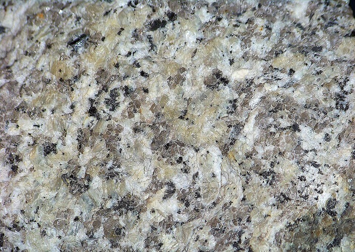 Gefüge: Anordnung der mineralischen Bestandteile, hier Quarz, Feldspäte und Biotit eines typischen Granits, Strzelin, Polen