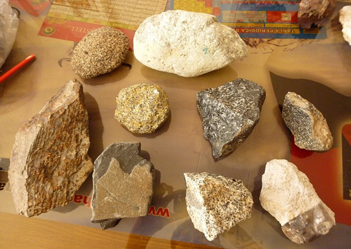 Proben magmatischer Gesteine, u. a. Andesit, Syenit, Gabbro, Diorit, Rhyolith, Basalt und Granit, Region Arequipa, Peru