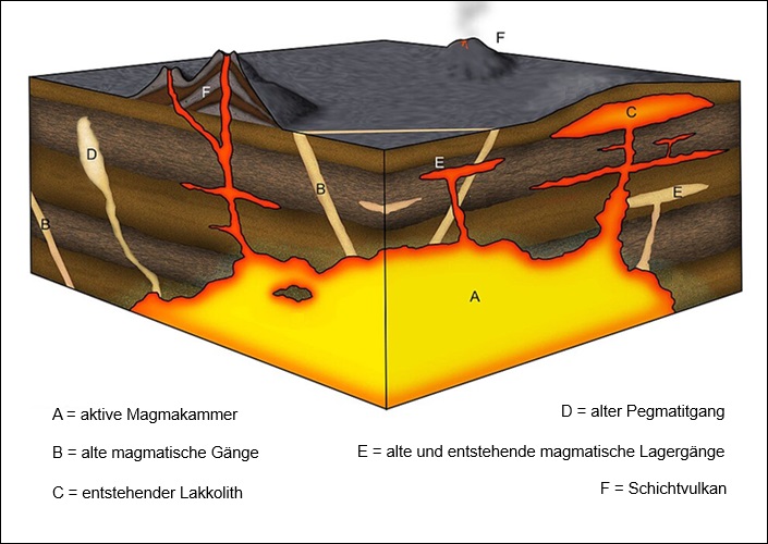 Schematische Darstellung magmatischer Strukturen und der Bildung entsprechender Gesteine und Gesteinskörper