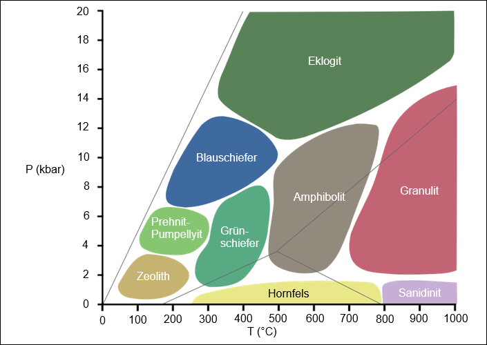 Ausprägung metamorpher Fazies im Druck-Temperatur-Diagramm, unter Bedingungen der Erdkruste und des Oberen Mantels