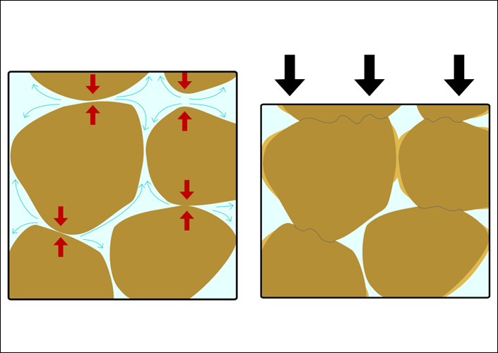 Schematische Darstellung von Verfestigung: aus Sediment wird Sedimentgestein, Druck wirkt im Trümmerfels