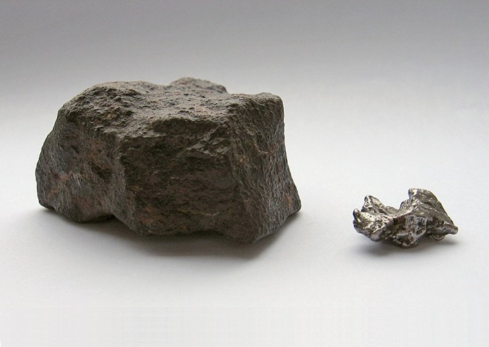 Kleine Festkörper kosmischen Ursprungs, hier Steinmeteorit (aus Marokko) und Eisenmeteorit (Argentinien, 1,5 cm)