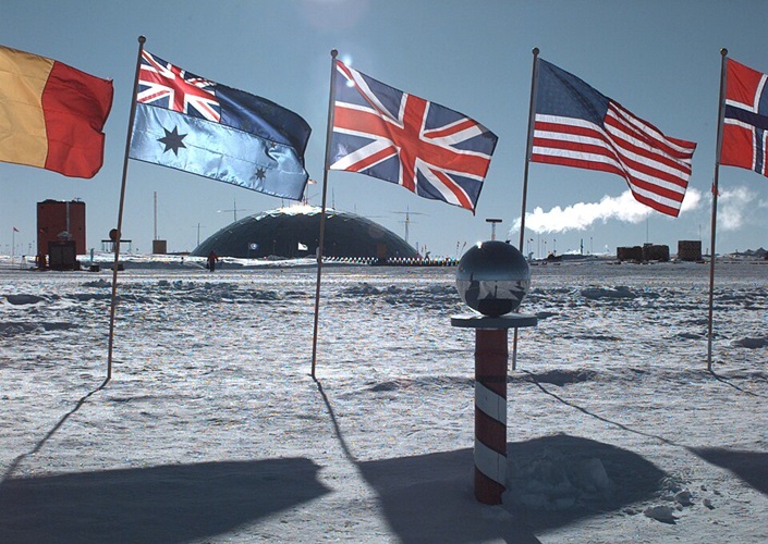 Südostwinde – vorherrschend am Boden der südlichen Polarzelle, hier mit (alter) Amundsen-Scott-Südpolstation, Antarktika