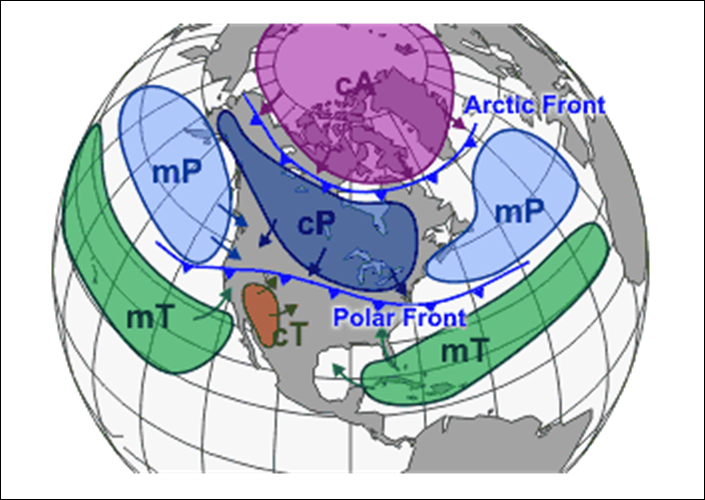 Wetterbestimmende Luftmassen Nordamerikas, ganz oben (cA) Bereich des nördlichen Polarwirbels