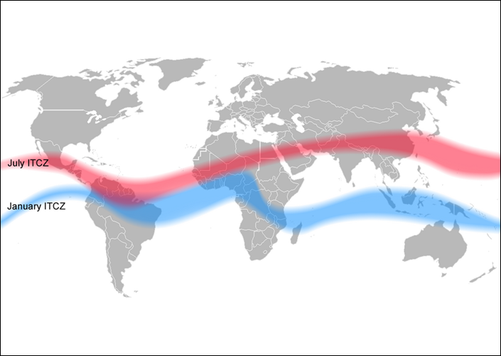 Lage der innertropischen Konvergenzzone (von Norden und Süden aufeinandertreffende Passatwinde) im Juli und Januar