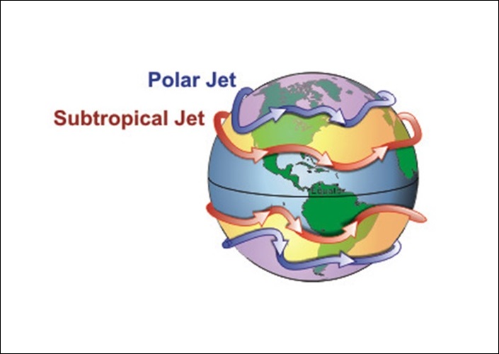 Jetstreams auf nördlicher und südlicher Halbkugel, sich dynamisch verlagernde Starkwindfelder in der oberen Troposphäre