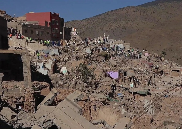 Zerstörung infolge des 2023-Marrakesh-Safi-Erdbebens im Bergdorf Imi N'Tala, Marokko