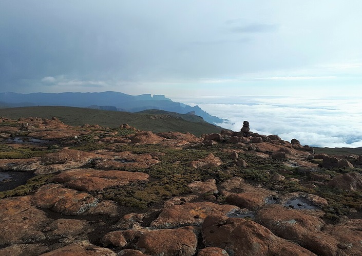 Gipfel des Mafadi über den Wolken, mit 3.450 m ü. M. der zweithöchste Berg der Drakensberge, Südafrika und Lesotho