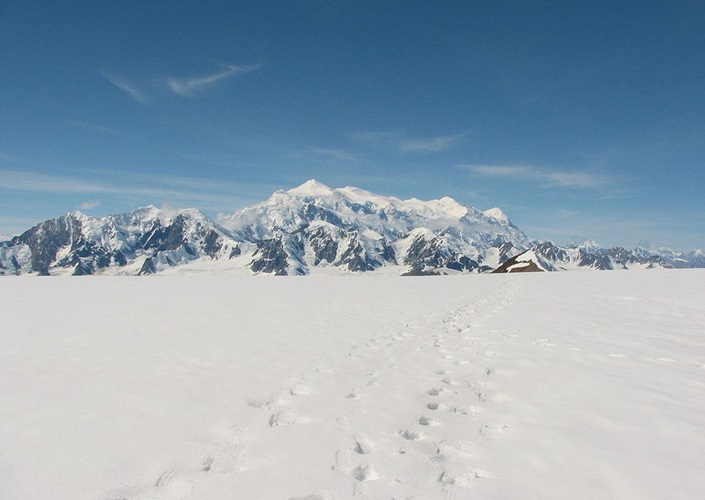 Mount Logan in der Eliaskette (vom Kluane Icefield gesehen), mit 5.959 m ü. M. der zweithöchste Gipfel Nordamerikas, Kanada