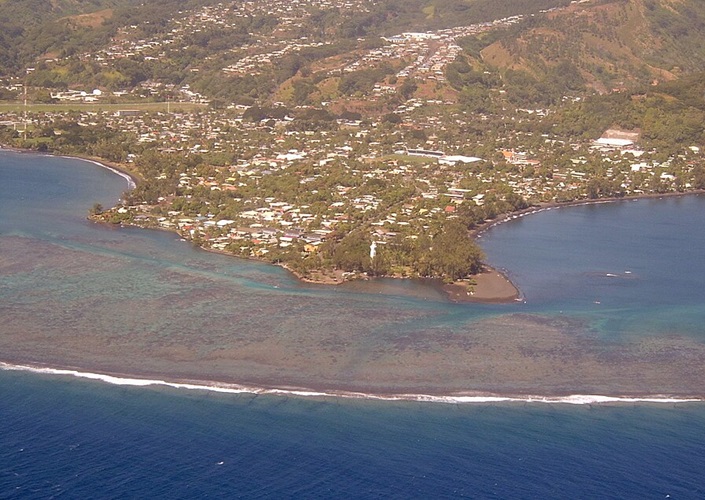 Luftaufnahme vom Kap Pointe Vénus, heute dicht bebaut, Hauptstadt Papeete, Insel Tahiti (1.042 km2), Französisch-Polynesien