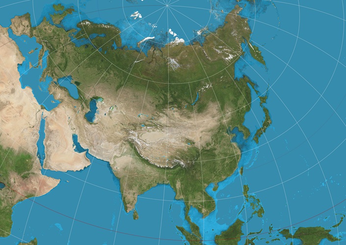 Größte Landmasse Eurasien (streng genommen gehört noch Afrika dazu), „Zwei-Punkt-Äquidistanzprojektion“