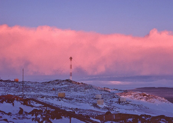Katabatischer Wind erreicht Küste von Adélieland, tiefstehende Sonne färbt Schneewolke, Dumont d'Urville Station, Antarktika