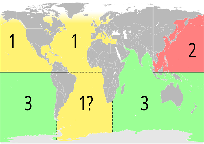 Bezeichnungen tropischer Wirbelstürme in den verschiedenen Regionen: 1) Hurrikan (Orkan), 2) Taifun, 3) Zyklon