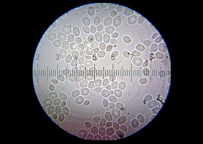 Backhefe, gehört zu den Hefen (einzellige Schlauchpilze), große Teilstriche hier jeweils etwa 1 µm