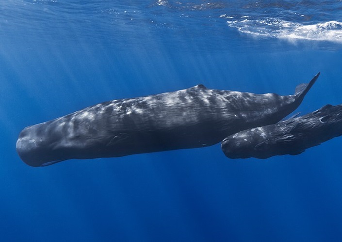 Pottwal-Mutter und ihr Kalb in der Nähe der Küste von Mauritius
