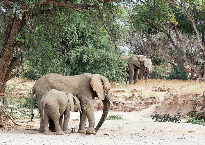 Afrikanischer Elefant (Loxodonta africana), hier „Wüstenelefanten“ am Huab-Fluss (Trockenfluss), Namibia