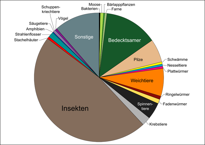 Kreisdiagramm zur rezenten Artenvielfalt (Pflanzen, Pilze und Tiere anhand von Klassen, Stämmen und Reichen)