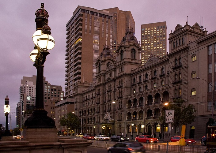 Windsor Hotel am Abend, Luxushotel (eröffnet 1884) in Melbourne, Australien