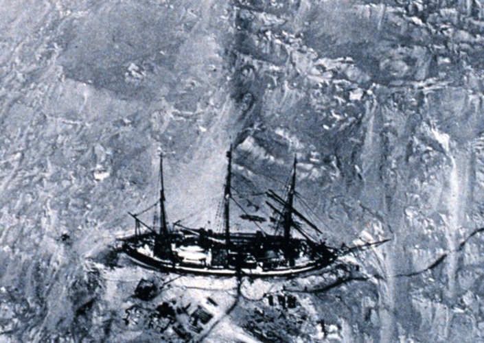 Im Eis eingeschlossene Gauß während der ersten deutschen Südpolarexpedition, Aufnahme aus einem Fesselballon, Antarktika