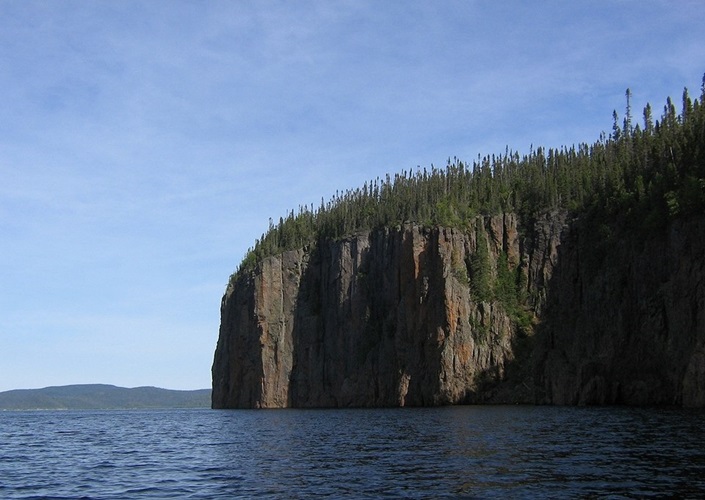 Kliff von dunklen Schmelzgesteinen im östlichen Bereich des Einschlagkraters von Manicouagan (ca. 215 Millionen Jahre), Kanada