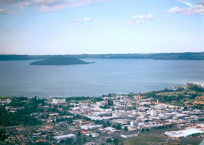 Lake Rotorua, Caldera eines vor etwa 140.000 Jahren ausgebrochenen Vulkans, Mokoia Island in der Mitte, Nordinsel, Neuseeland