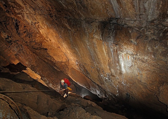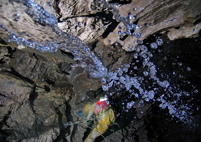 Kruber-Woronja-Höhle, die vielleicht tiefste Höhle der Welt (ca. 2.200 m), Speläologin bei 1.340 m, Abchasien, Georgien