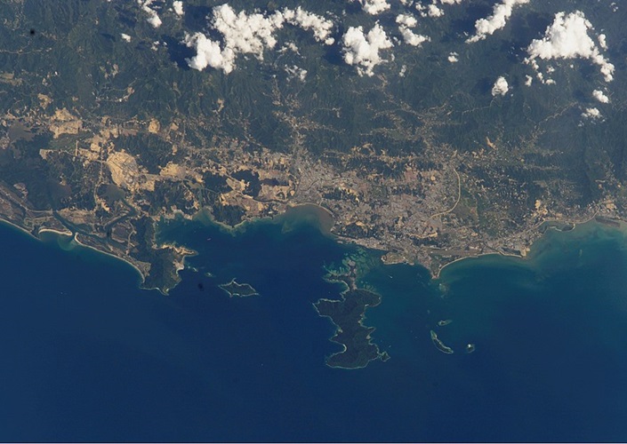 Drittgrößte Insel Borneo, Satellitenaufnahme von Brunei Bay und Kota Kinabalu, der Hauptstadt von Sabah in Ostmalaysia