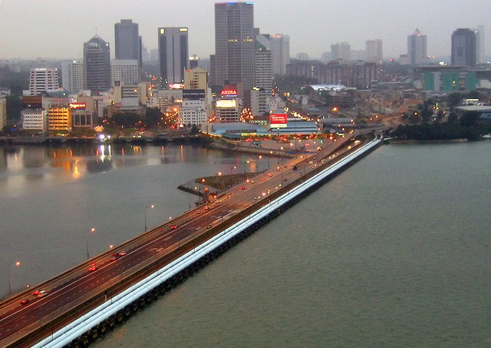 Blick zur Insel Pulau Ujong, der Johor–Singapore Causeway verbindet als Damm das malaiische Festland mit Singapur