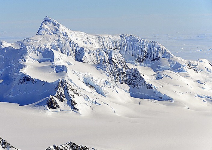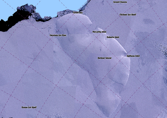 Satellitenbild der Berkner-Insel, der größten „Eiskuppel“ der Erde, höchster Landpunkt ca. 80 m u. M., Antarktika