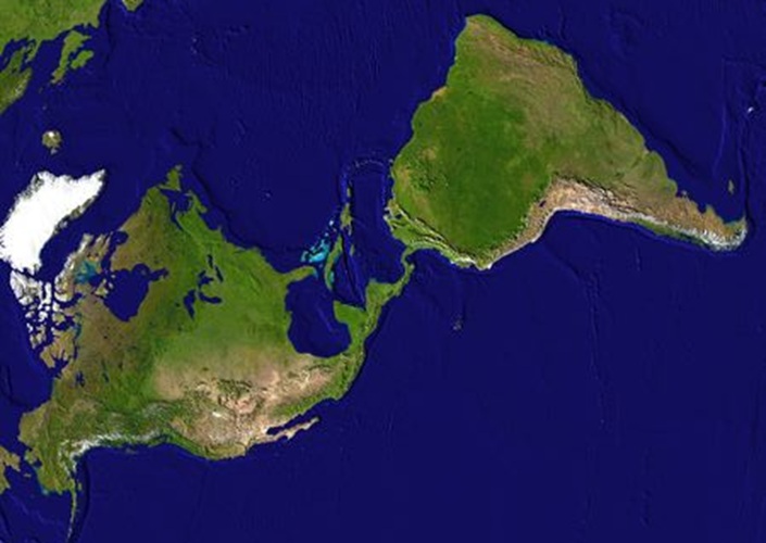 Größte Landmasse Eurasien (streng genommen gehört noch Afrika dazu), „Zwei-Punkt-Äquidistanzprojektion“