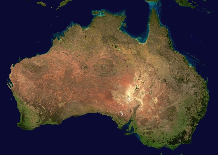 Kleinster Kontinent Australien, Satellitenaufnahme der Landmasse ohne ozeanische Inselwelt