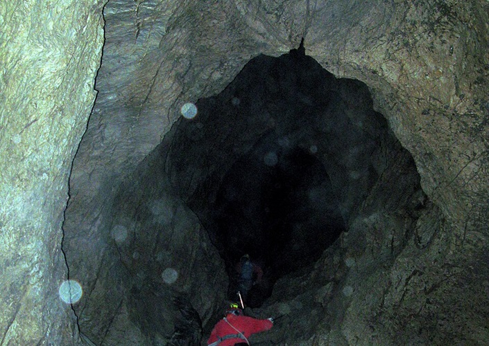 Kruber-Woronja-Höhle, die vielleicht tiefste Höhle der Welt (ca. 2.200 m), Speläologin bei 1.340 m, Abchasien, Georgien