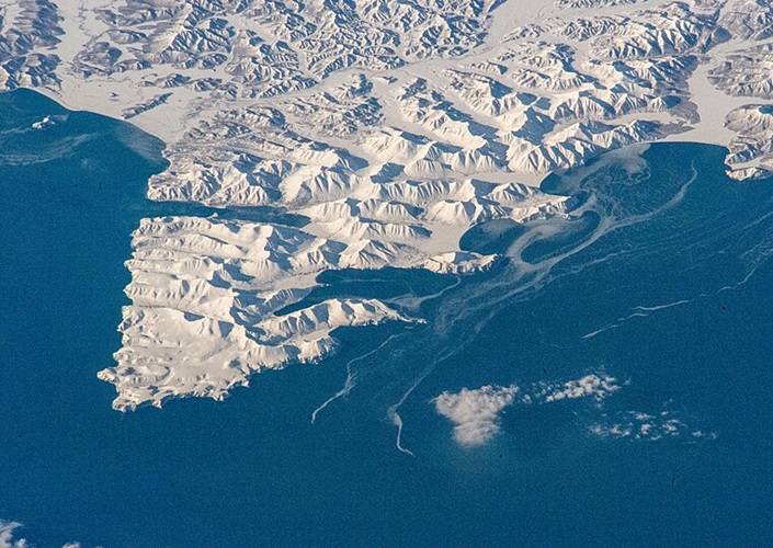 Kleine Halbinsel an der Südostküste der großen Halbinsel Kamtschatka, aufgenommen von der ISS aus 426 km Höhe, Russland