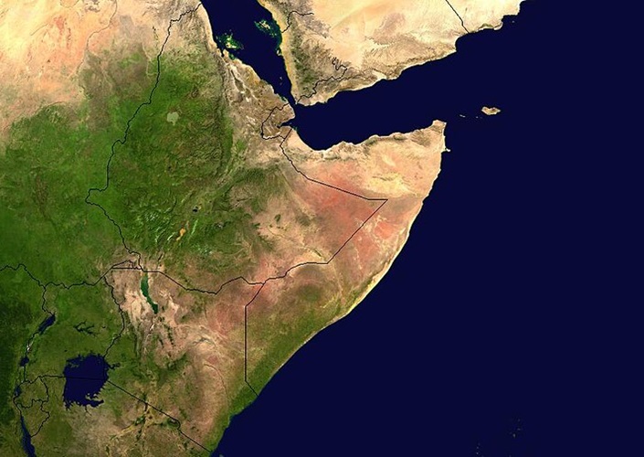 Somali-Halbinsel, Satellitenaufnahme am „Horn von Afrika“, südlich des Golf von Aden, Somalia