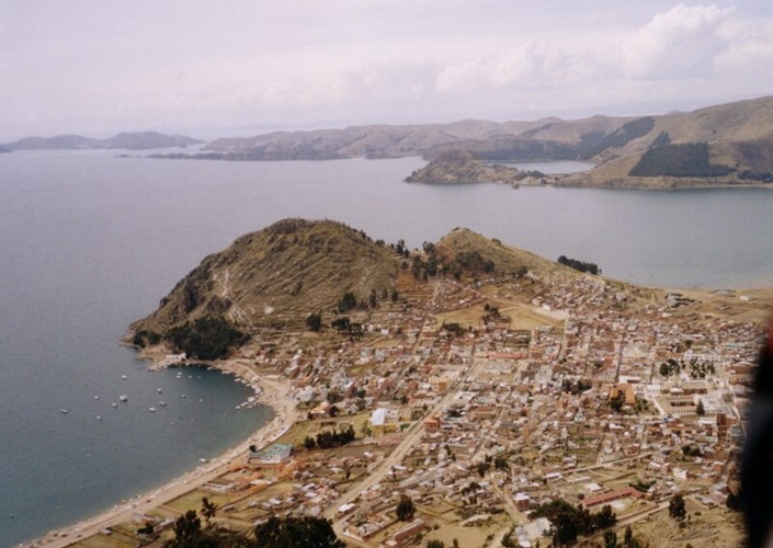 Halbinsel Copacabana im Titicacasee, gesehen vom Gleitschirmflug, Bolivien