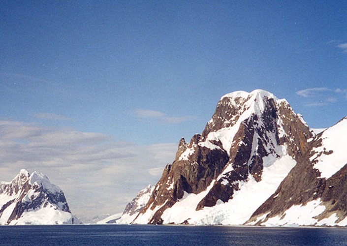Mount Scott auf der Westseite der Antarktischen Halbinsel, links die kleine Booth-Insel, Antarktika