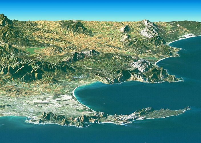 Kap-Halbinsel mit False Bay, links die Tafelbucht, perspektivische Ansicht zusammengesetzt, Kapstadt, Südafrika