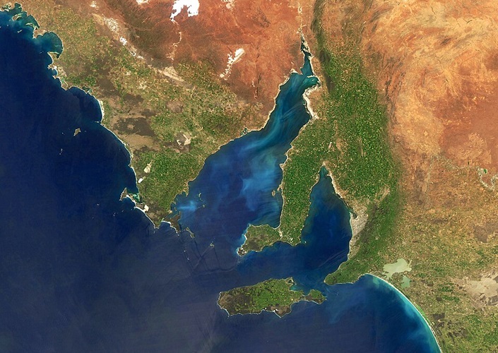 Satellitenaufnahme von Spencer-Golf (links) und Gulf Saint Vincent (mit Adelaide), von einem NASA-Satelliten, Australien