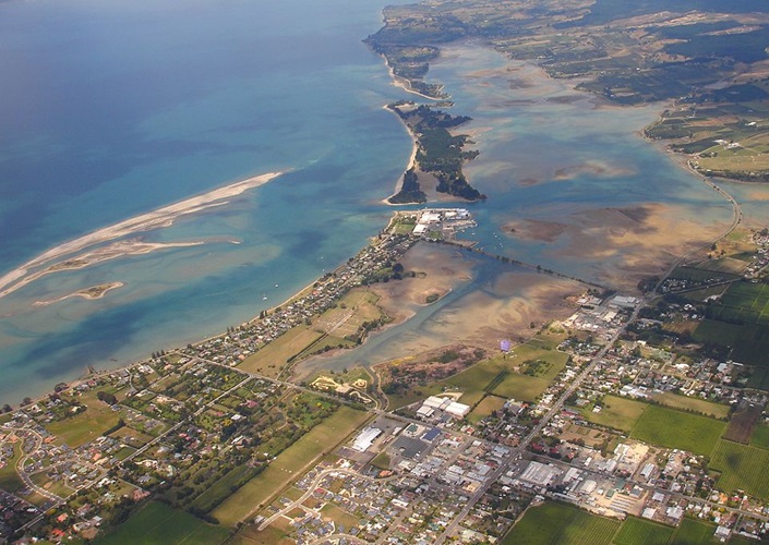 Küste und Tasman Bay bei Motueka, große V-förmige Bucht am Nordende der Südinsel, Neuseeland