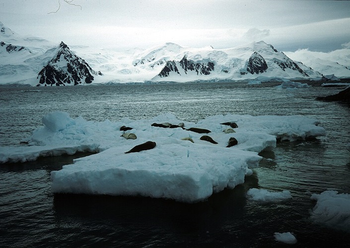 Robben auf einer Eisscholle im Bourgeois-Fjord, Antarktische Halbinsel, Antarktika