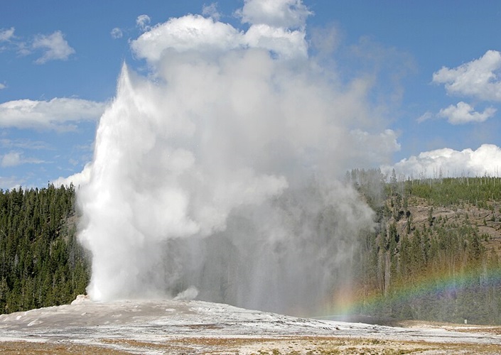Ausbruch des Geysirs Old Faithful im Yellowstone-Nationalpark, mit Regenbogen, Wyoming, Vereinigte Staaten