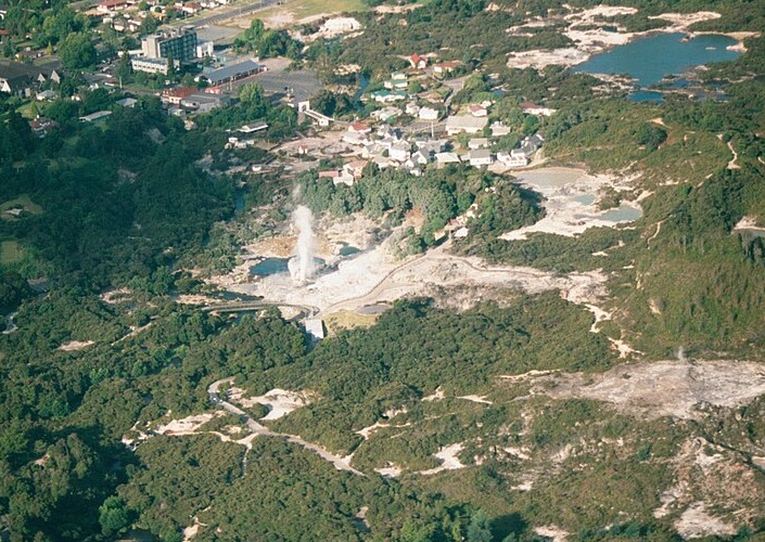 Luftaufnahme vom Geysirfeld Whakarewarewa, mit gerade ausbrechendem Pohutu-Geysir, Nordinsel, Neuseeland