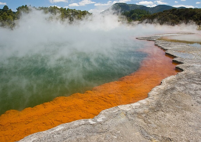Farbig bekannte Thermalquelle Champagne Pool im Geysirfeld Wai-O-Tapu Thermal Wonderland, Nordinsel, Neuseeland