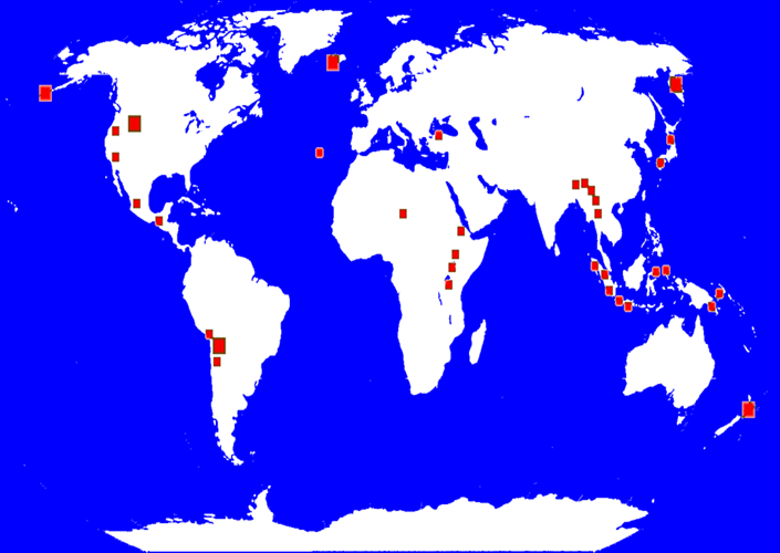 Vorkommen von Geysiren über die Kontinente der Erde