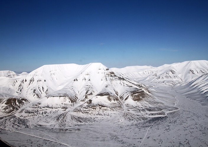 Adventdalen, Berg Hiorthfjellet mit Eisfeldern, östlich vom Hauptort Longyearbyen, Insel Spitzbergen (Svalbard)