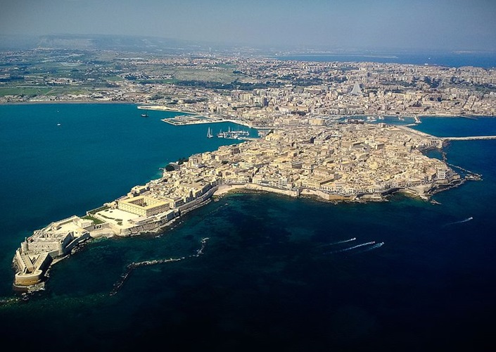 Ansicht von Syrakus mit der Insel Ortygia vorn, mit 48,8°C (2021) neuer Hitzerekord in Europa, Italien