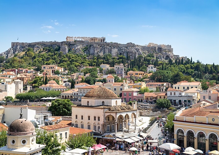 Athen mit Akropolis und Platz Monastiraki (vorn), hielt mit 48,0°C (1977) alten Hitzerekord in Europa, Griechenland