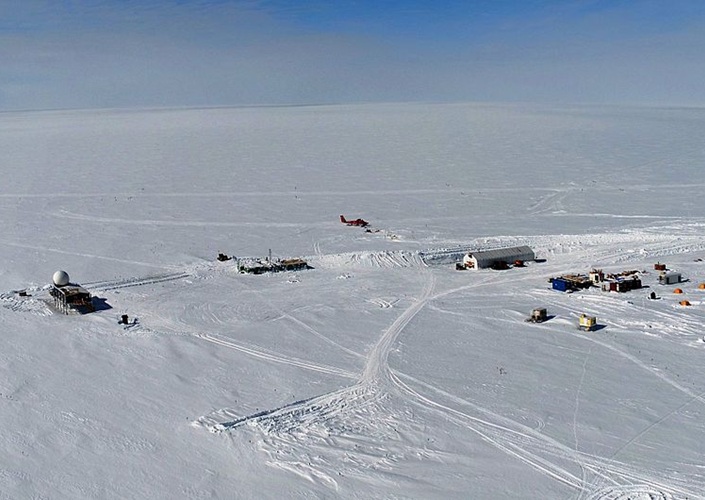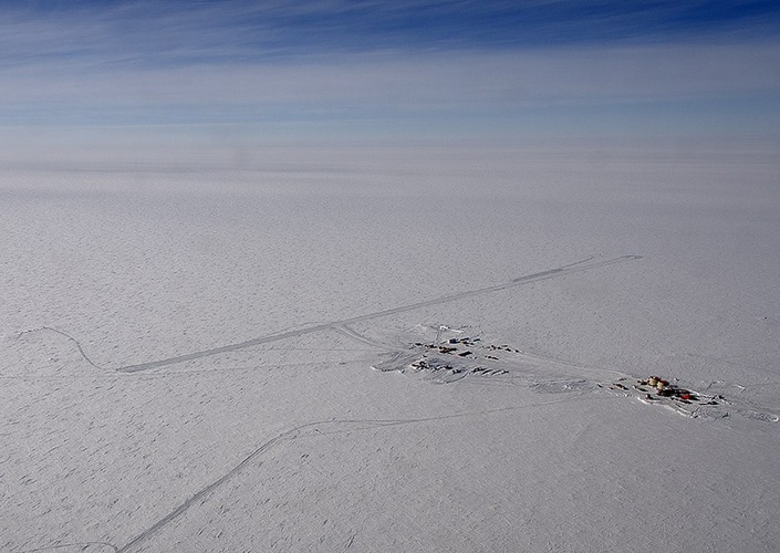 Dome C (mit Station Dome Concordia) aus der Luft, mit –93,0°C (2010) Kälterekord der Welt, Wilkesland, Antarktika